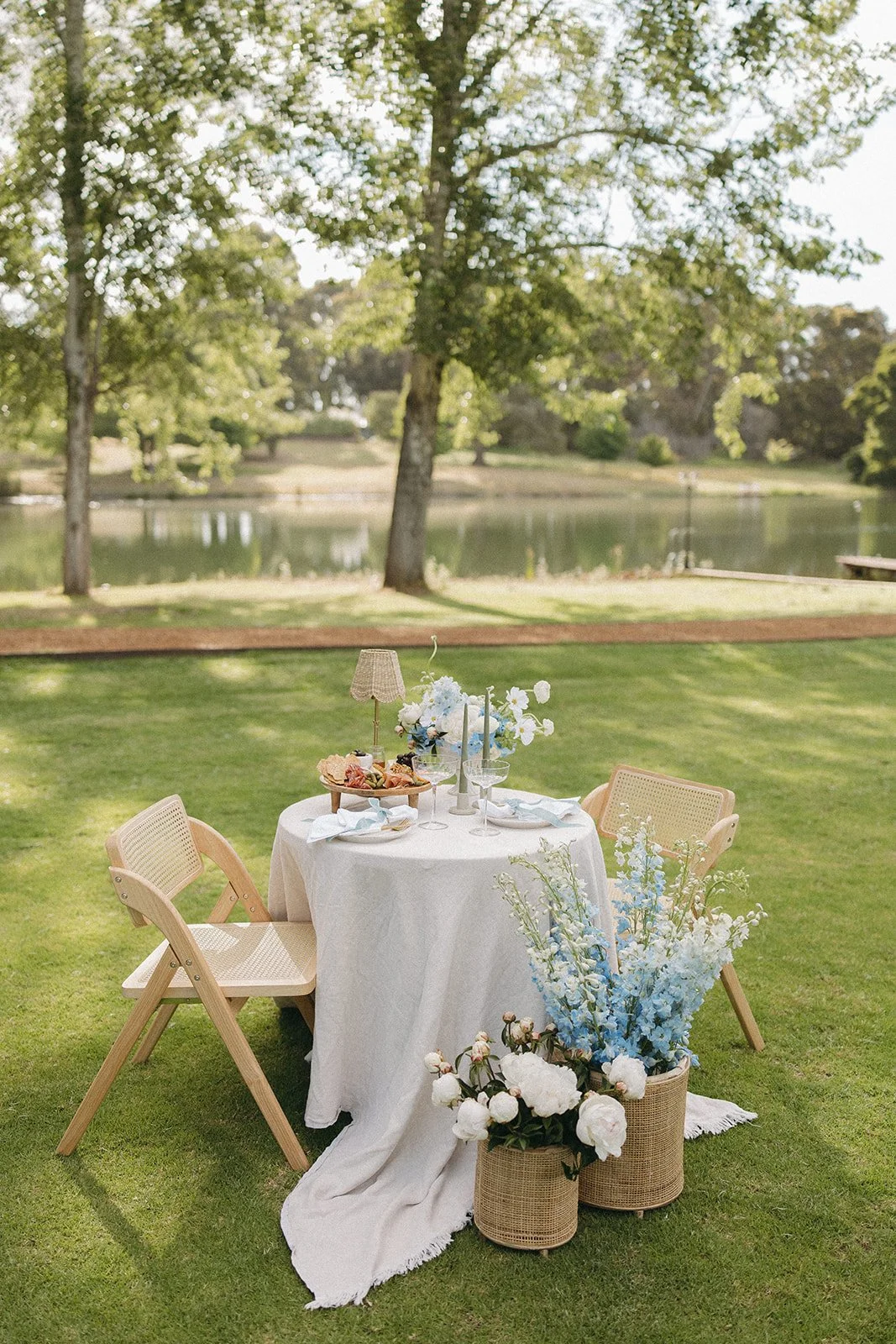 An intimate dining style proposal set within a garden setting, designed for couples who love a relaxed yet refined atmosphere. Enjoy a beautifully styled table for two with florals, soft lighting, and thoughtful details, followed by time together to celebrate with champagne and grazing after the proposal.